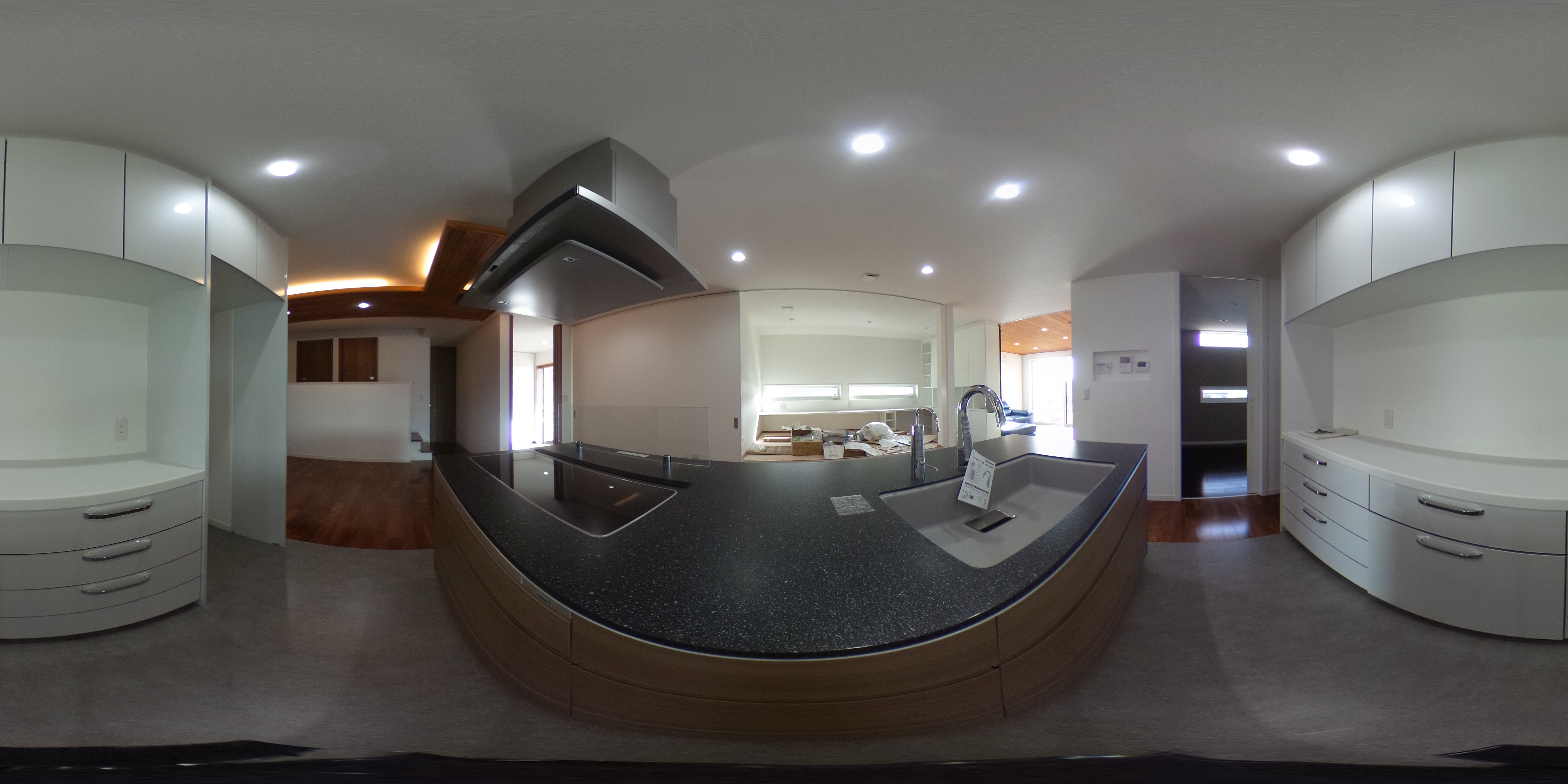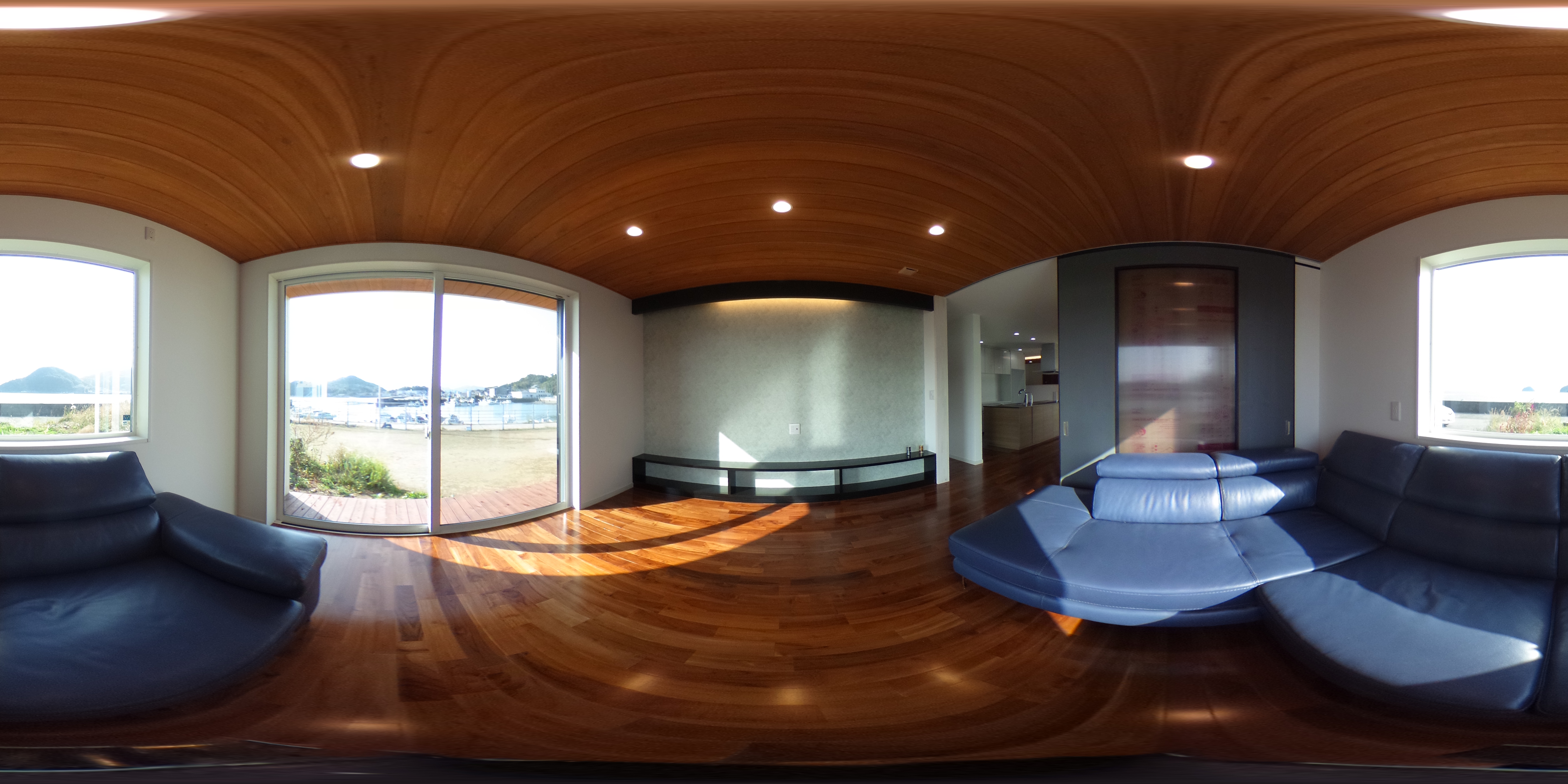 リビング:天井板張り TVボード造作 YKKAPW 全部屋:熱交換ユニット換気システム(パナソニック)